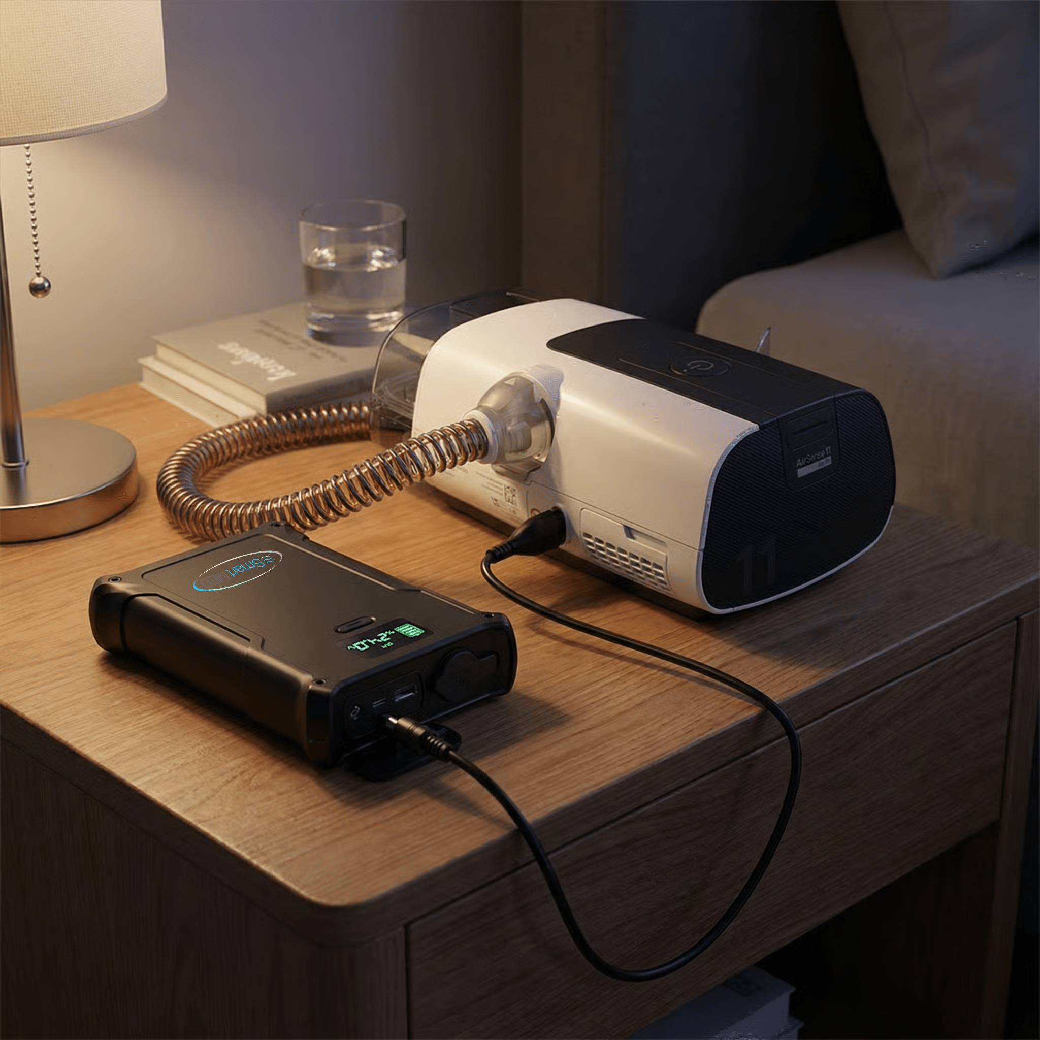 The SmartMed AirPro Mini battery pack is a Multi-Volt, multi-night 12-24V Lithium Ion CPAP power supply that works with all CPAP machines.